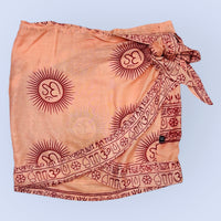 Falda pareo salmón con dibujo estampado en rojo.