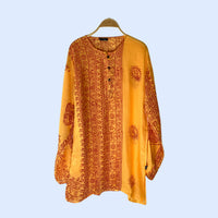 Kurta de tejido clásico en color amarillo anaranjado y con detalles en rojo.