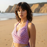 El diseño de este top permite atarlo de distintas maneras. (Lo entregamos con un aro para uno de los atados)